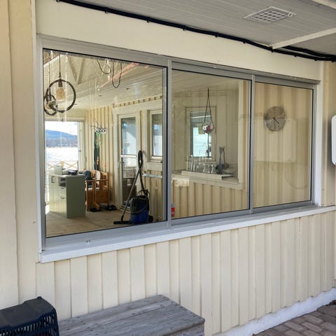Inglasning med skjutbara fönsterpartier för uterum eller altan. Består av flera glaspartier i aluminium- eller metallram som löper i skenor. Passar för att skapa ett vind- och regnskyddat utrymme med god utsikt, exempelvis uterum, altan eller veranda. Fönsterpartierna kan öppnas för vädring och stängas för att ge skydd mot väder.