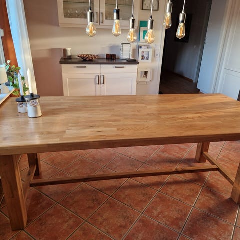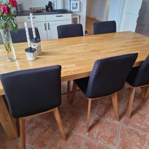 Matbord I massiv ek (behöver slipas och oljas) 6 stolar medföljer I varierande skick. Bordet är tungt 2000:-