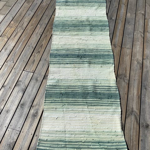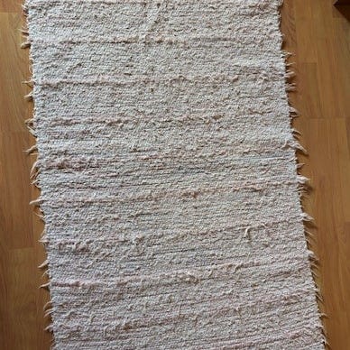 Randig trasmatta i rosa och vitt. Mattan har ett vävt mönster med horisontella ränder och fransar i kortändarna. Passar exempelvis i hall, kök eller mindre rum. Materialet är vävt tyg/trasor. Är Tvättad
