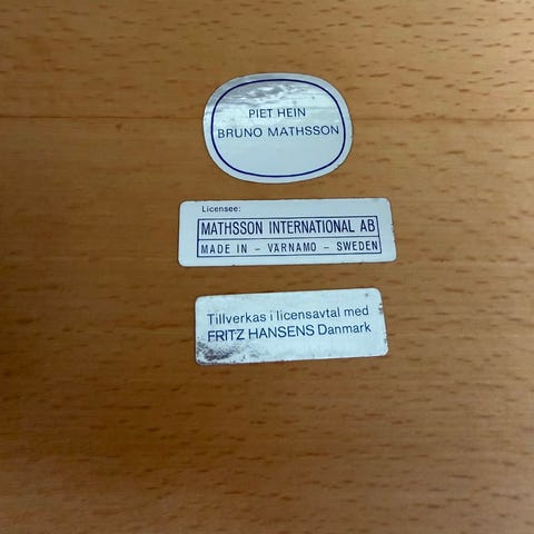 Fritz Hansen Bruno Mathsson matbord med ellipsformad bordsskiva i trä och löstagbara ben i metall. Bordet är märkt med etiketter från Mathsson International och Fritz Hansen. Passar som matbord eller arbetsbord i kök, vardagsrum eller matsal. Bordsskivan har en ljus träyta och benställningen består av flera smala metallben per sida som fästs i beslag under bordsskivan. Bordet är avsett för inomhusbruk. Nypris ca 27000kr
