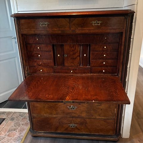 Gammal chiffonjé säljes. Den har 4 stora lådor, samt 8 små lådor och ett litet "skåp".
