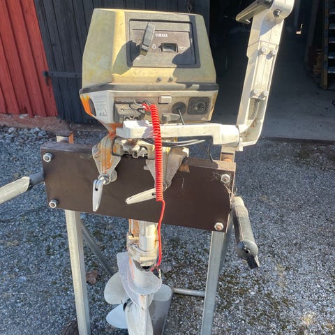 Yamaha 5 hk utombordare i grå färg. Motorn är en bensindriven utombordsmotor med rorkult och inbyggd bränsletank. Propellern är en trebladig modell. Passar mindre båtar, jollar eller som hjälpmotor. Konstruktionen är avsedd för montering på akterspegel och ger enkel manövrering med handtag/rorkult.