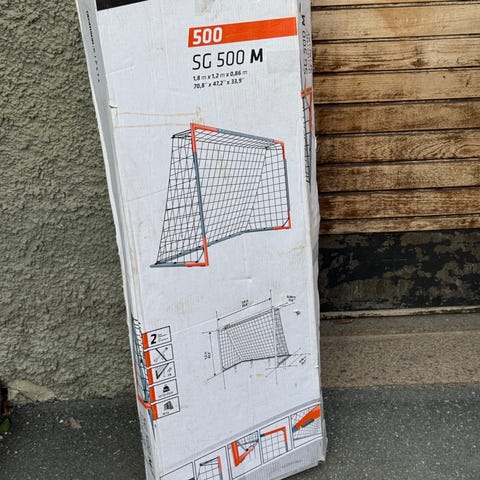 Fotbollsmål och returbollnät i metall med nät av plast. Målet har en klassisk rektangulär form med djup ställning baktill. Returbollnätet har en fristående ram i metall med nät som returnerar bollen vid skott. Utrustningen är avsedd för fotbollsträning och lek utomhus i trädgård eller på gräsyta.
