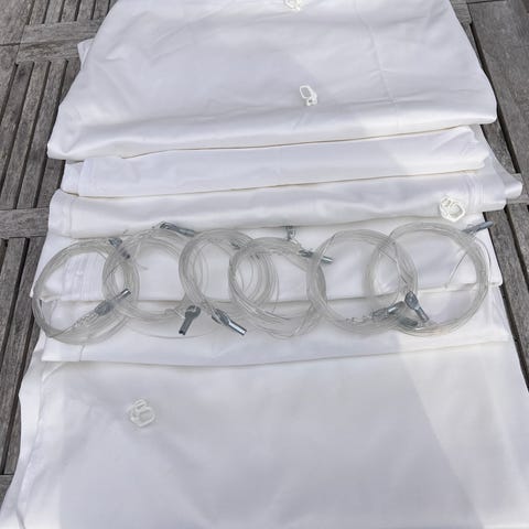 Här följer med gardin och två skenor till Maxi 4 (11,4 kvm). Krokar finns också men rekommendera att köpa nya öglor som löper i skenorna.