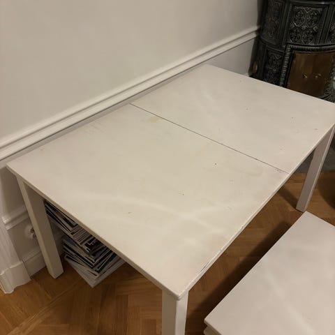 Gediget bord i massivt trä. Fästet för ett av benen är trasigt men kan fixas.