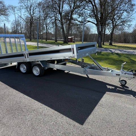 Högbyggd släpvagn med fällbara lämmar runt om för enkel lastning.