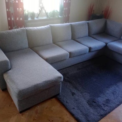 IKEA hörnsoffa i mörkgrått tyg. Soffan har schäslongdel på ena sidan och raka armstöd. Klädd i enfärgat tyg med lösa rygg- och sittdynor. Passar som större sofflösning i vardagsrum med gott om sittplatser.