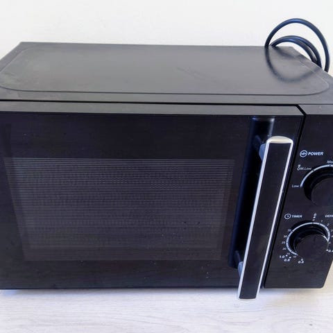 Power mikrovågsugn i svart utförande. Fristående modell med frontlucka i glas och manuella vred för inställning av effekt och tid. Passar för uppvärmning och enklare tillagning av mat i kök, studentbostad eller kontor.