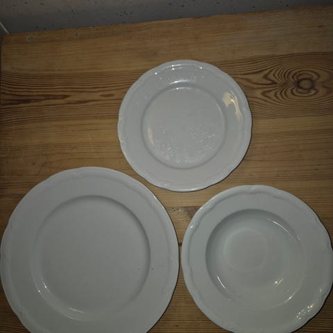 Rosenthal djupa tallrikar i vitt porslin. Tallrikarna har rund form med bred kant och upphöjt reliefmönster runt om. Passar för servering av exempelvis soppa, pasta eller gryträtter. Säljes som uppsättning enligt bild.