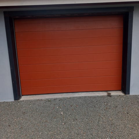 Dieden vipport garageport i brun metall. Porten är vertikalprofilerad och monterad i karm med fjädermekanism på insidan. Utrustad med handtag och låscylinder på utsidan. Passar som utbytesport till befintligt garage där mått och infästningar anpassas efter nuvarande öppning.