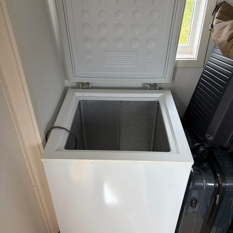 Whirlpool frysbox i vit färg. Modellen är en klassisk toppöppnad frysbox. Invändigt finns lösa trådkorgar för sortering och enklare åtkomst till frysta varor. Utsidan är slät och vit, med ventilationsgaller på kortsidan. Lämplig som extra frysutrymme i till exempel förråd, källare eller garage.