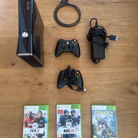 Fullt fungerande Xbox 360 S konsol med Kinect kamera och en handkontroll. Det följer även med en förlängsningssladd till kameran så man enkelt kan flytta den vid behov.