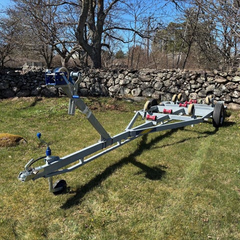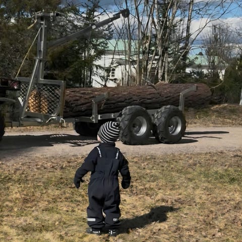 Timmervagn för ATV med kranarm, timmerkrok och fjärrstyrd elvinsch. Ett nytt hjul. Leverans ej med batteri. 9000 eller bud. Inga byten.