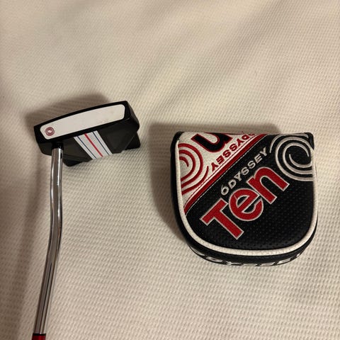 Odyssey Ten putter i svart utförande. Putterhuvud i mallet‑stil med tydliga siktränder på ovansidan. Framsidan har en insert med präglat mönster för jämn bollrull.