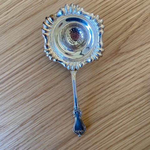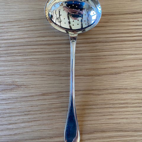 Sked i silver med dekorativt handtag