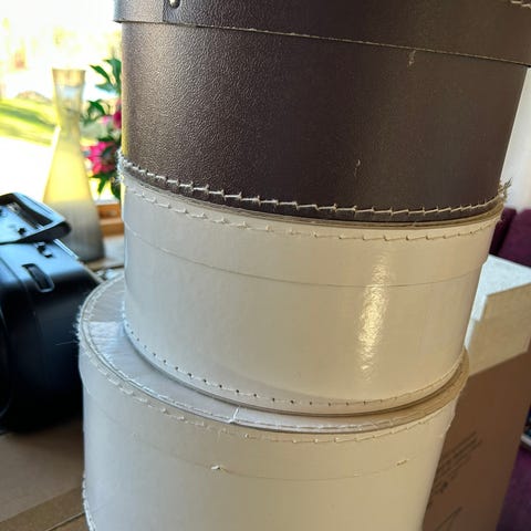 Förvaringslådor i tyg med metallhandtag på kortsidorna. Lådorna är i beige och svart färg och har lock. Passar för förvaring av mindre saker i hylla, garderob eller på skrivbord. Stapelbara för att spara plats.