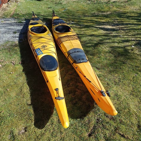 Havskajak Havspaddeln Eskimå i gul färg. Enmanskajak med sittbrunn och två packluckor fram och bak. Utrustad med däckslinor och nät för extra packning. Det ingår delbar paddel, kajakvagn med luftgummihjul samt flytväst som syns på bilderna. Lämplig för tur- och fritidspaddling på sjö eller kustvatten.