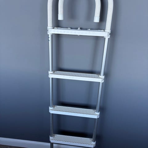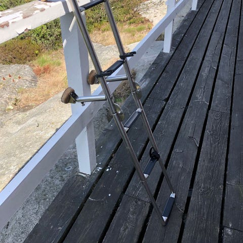 Uppvikbar badstege i rostfritt med teaksteg för akterspegel säljes i fint skick!