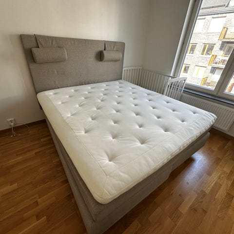 KungSängen säng med tillhörande sänggavel och bäddmadrass. Sängen har en vadderad, tygklädd gavel i beige ton med lösa nackkuddar. Underdelen består av en klädd sängbas i liknande beige tyg och en vit, knappquiltad bäddmadrass ovanpå. Passar som dubbelsäng i sovrum. Materialet är textilklädd stomme och gavel med stoppning för bekvämt ryggstöd vid sittande i sängen.