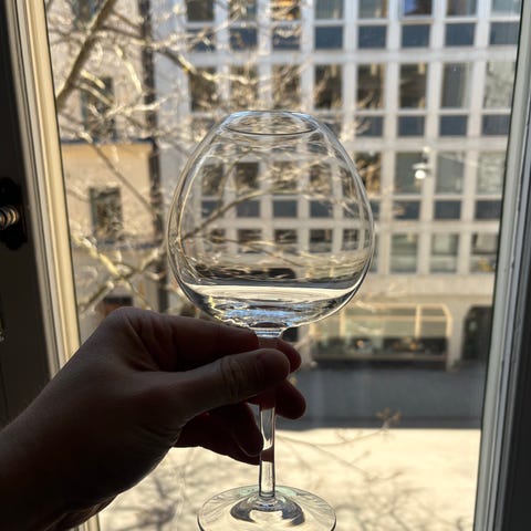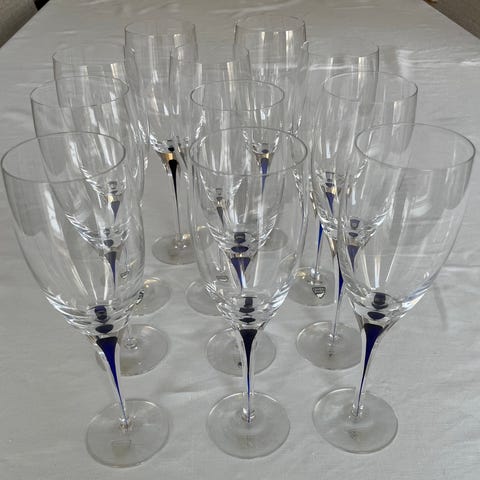 Glasserie Basic av Margareta Hennix, Reijmyre 1993. Klarglas med blå fot. Servis innehållande 6 ölglas, 7 vinglas (ett med liten nagg) samt 4 snapsglas.