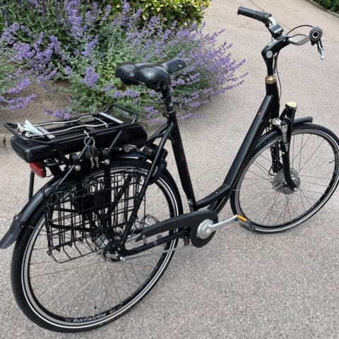 Utrustad med framhjulsmotor, batteri placerat på pakethållaren bak samt navväxel.