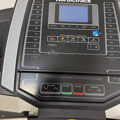 NordicTrack löpband i svart och grått. Utrustat med digital display och kontrollpanel med snabbknappar för start, stopp, hastighet och lutning. Panelen visar bland annat tid, distans och kaloriförbrukning samt har förinställda träningsprogram. Löpbandet har räcken på sidorna och en löpyta anpassad för inomhusträning. Passar för gång- och löpträning i hemmet.