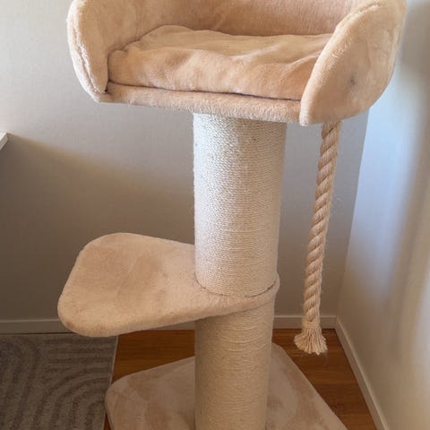 Kattunnel i form av ett klösrör i beige färg. Utsidan är klädd i klösvänligt material och insidan i mjuk plysch. Ena öppningen har en hängande boll som leksak för katten. Passar som viloplats och lekplats för inomhuskatter.