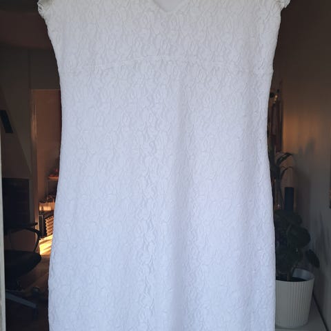 Vit delvis fodrad spetsklänning i stretchigt material. Smickrande fin urringning och lätt utsvängd modell. Fin till student/ skolavslutning el fest. Storlek M.