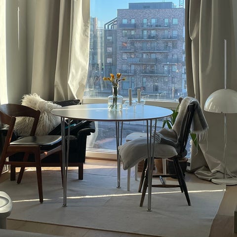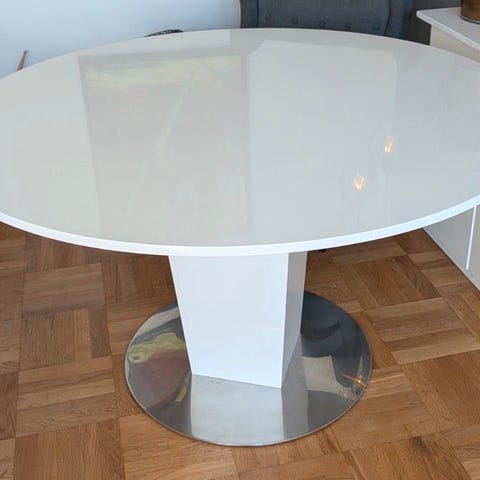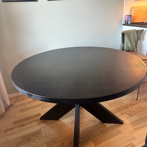 Matbord från Nordiska rum, diameter 130cm, höjd 74cm. Matbordet är i bra skick, lite avskavt i kanterna på sina håll (se bilder). Får med lätthet plats 6 breda stolar runt.