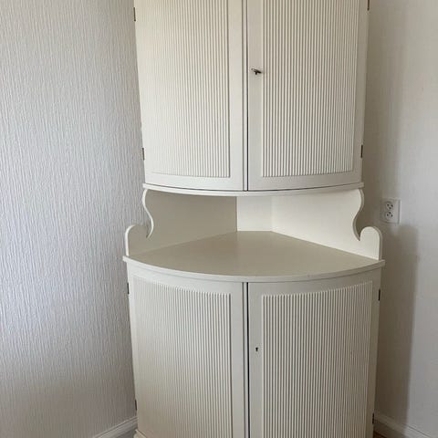 Vitt hörnskåp med två skåpluckor och ett öppet mellanutrymme med två hyllplan. Säljs mot hämtning.