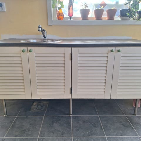 Säljer tvättbänk/diskbänk med rostfri bänkskiva och integrerad tvättho. Underdel med ett skåp med dörr samt flera utdragbara trådkorgar i metall för förvaring. Passar exempelvis i kök, tvättstuga eller groventré där både arbetsyta och förvaringsmöjligheter behövs.