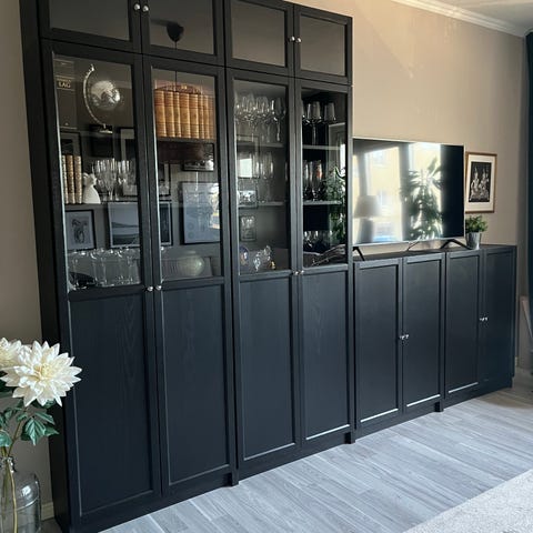 8 glas dörrar. Varje glasdörr är 40 cm bred och 84cm hög. 2st skåp med 3 hyllplan i varje skåp.