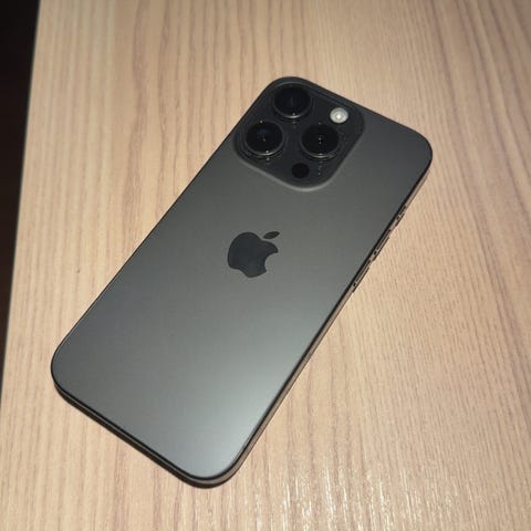 Apple iPhone 15 Pro smartphone med 256 GB lagringsutrymme. Modellen har en silverfärgad baksida med trippelkamera och framåtriktad skärm med sensorpanel.