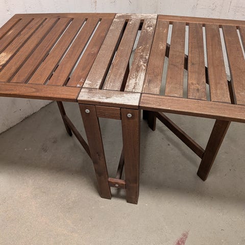 Vitt hopfällbart träbord med blombricka. Bordet har ben i kors och en rektangulär bricka upptill och en mindre bricka nedtill. Lämplig för inomhusbruk eller på balkong/uteplats under tak. Levereras i en kartong med skyddande förpackning, som visas på bilderna.