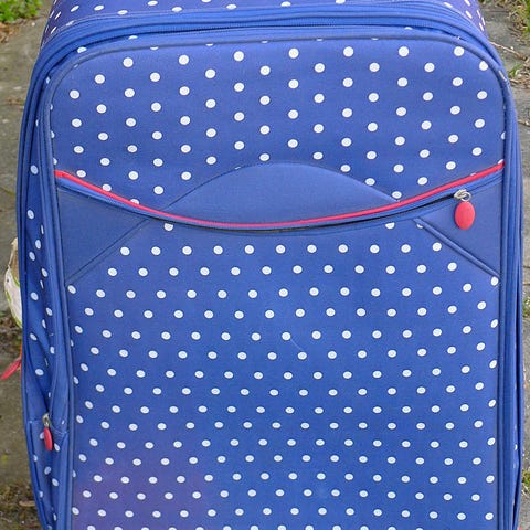 Mycket rymlig resväska 55x80x35 cm utv mått. Rullhandtaget trasigt men eftersom den är så hög funkar bärhandtaget utmärkt att rulla med. Rullar bra.