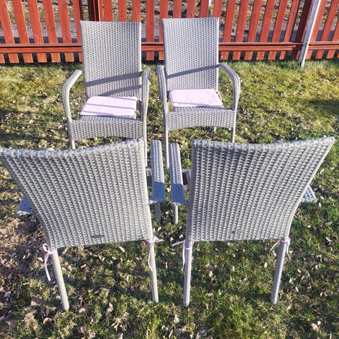Stapelbara trädgårdsstolar i beige konstrotting. Stolarna har armstöd och metallstomme med flätad sits och ryggstöd. Passar för utomhusbruk på altan, balkong eller i trädgård. Säljer alla tillsamans 4250kr 34st 125kr/st