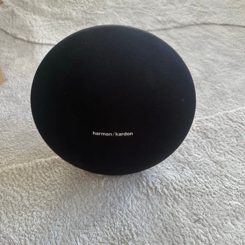 Harman Kardon högtalare i svart färg. Rund, kompakt modell som lämpar sig för användning i hemmet, till exempel för musiklyssning eller anslutning till TV eller dator via kompatibla ljudkällor. Exakta anslutningar och effekt beror på specifik modellbeteckning som inte framgår av uppgifterna.