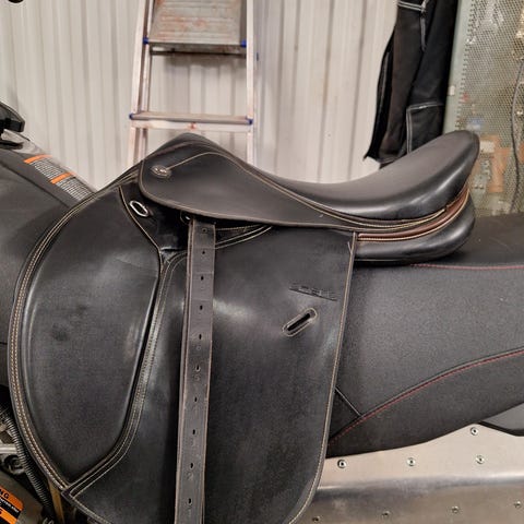 Barbackagjord i svart läder inklusive stigbyglar och stigläder.