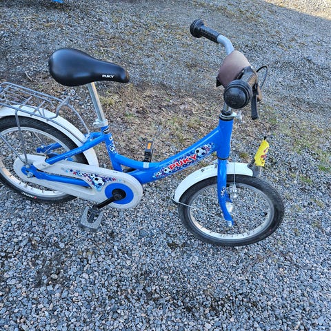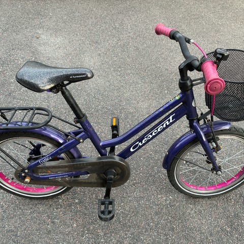 Crescent barncykel 16" i vit och blå färg. Cykeln har 16-tums hjul, pakethållare bak, korg fram, kedjeskydd, handbroms fram och fotbroms. Lämplig för barn 4-6 år (100-125 cm)