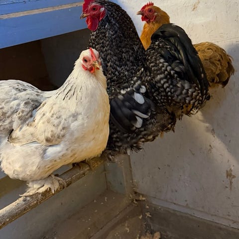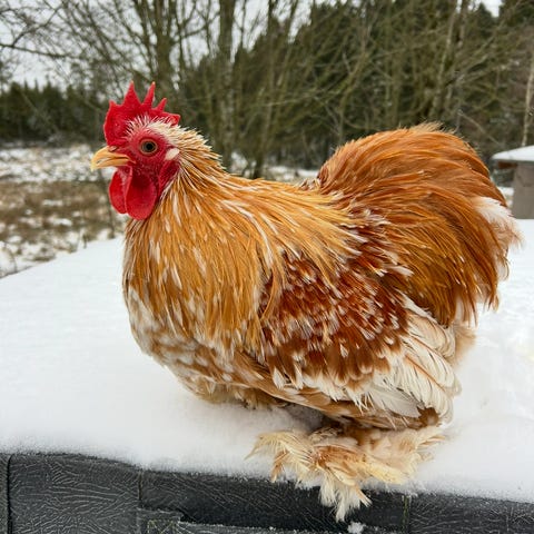 Han är dock en väldigt bra tupp till sina hönor och följer med dem in och ut när de ska lägga ägg. Han gör alltid allt för att hålla dem glada och nöjda.