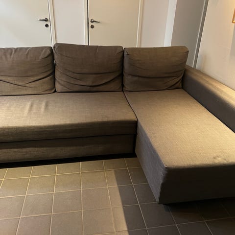 IKEA bäddsoffa i grått tyg. Soffan har rak modell med breda armstöd och lösa ryggkuddar. Klädseln är i textil och soffan är avsedd för inomhusbruk. På ryggstödet syns mindre fläckar på tyget (tvättbart).