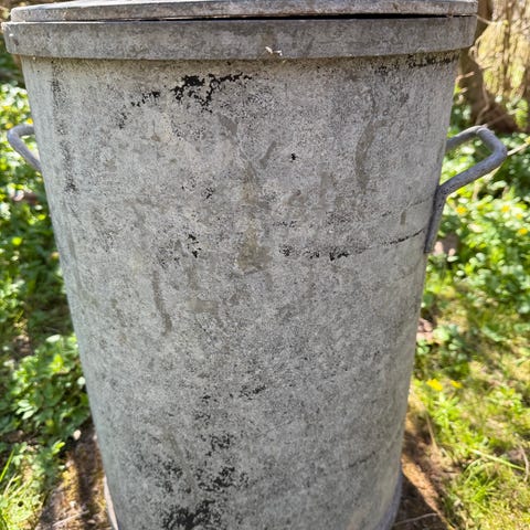 Gammal mjölkspann i metall. Spannen har lock och bärhandtag upptill. Ytan är sliten och rostig, vilket ger ett tydligt patinerat utseende. Kan användas som inredningsdetalj, dekoration i trädgård eller för förvaring enligt behov. Ca 35 cm hög. Kan levereras i Kalmar.