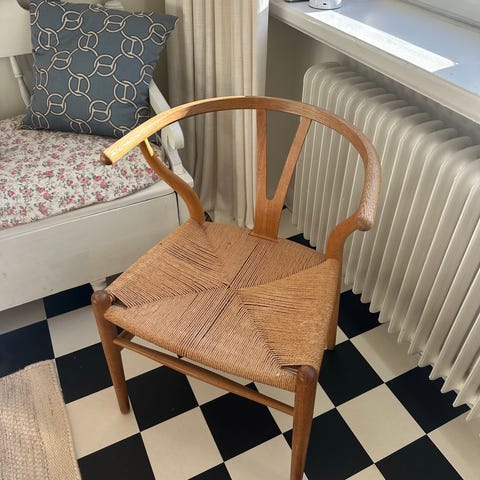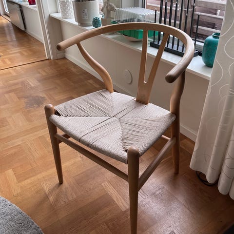 Carl Hansen CH24 stol formgiven av Hans J Wegner. Klassisk pinnstol med svartlackerad trästomme och naturfärgad flätad sits i papperssnöre. Stolen har karakteristiskt Y-format ryggstöd och rundad överliggare som ger stöd för rygg och armar. Passar som matstol eller fristående stol i exempelvis vardagsrum, hall eller arbetsrum.
