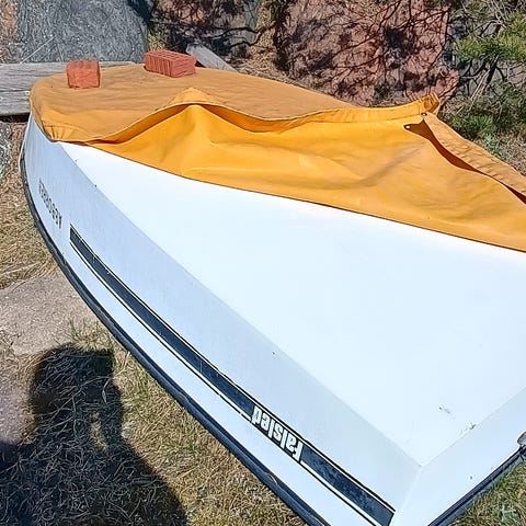 Båten är i bra skick för sin ålder, knappt lagad och plastad. Det blåa är org gelcoat, bara lite bättrad i hörnen.