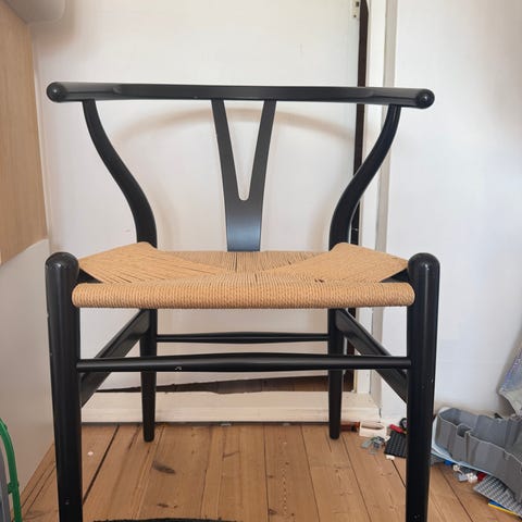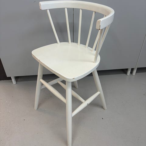 Hay stol i vit färg. Stolen har ryggstöd med spjälor och rundad överkant samt fyra raka ben. Sitsen är slät och lätt rundad framtill. Utförd i trä och passar exempelvis vid matbord, skrivbord eller som extra sittplats i hemmet.
