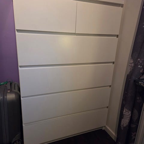 En låda på ena byrån har ett stag undertill som behöver en ny skruv men annars fullt ok. Lådan funkar bra men glipar ett par mm.