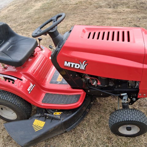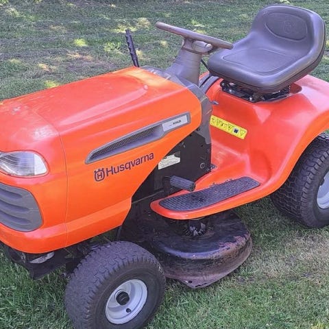 "Åkgräsklippare i röd färg med sits och rattstyrning. Maskinen är avsedd för klippning av gräsmattor och större ytor. Klippaggregatet är monterat under maskinen och den har grovmönstrade däck för bättre grepp på gräsmattan. Passar för användning i trädgårdar och andra grönytor där man vill klippa gräset sittande på maskinen."
