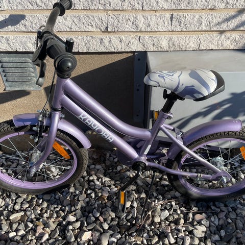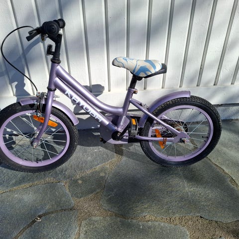 Scott Contessa barncykel med 16" hjul. Cykeln har lila ram med tryckta enhörningar och kedjeskydd som täcker kedjan. En dröm för 4/5-åringen 😄