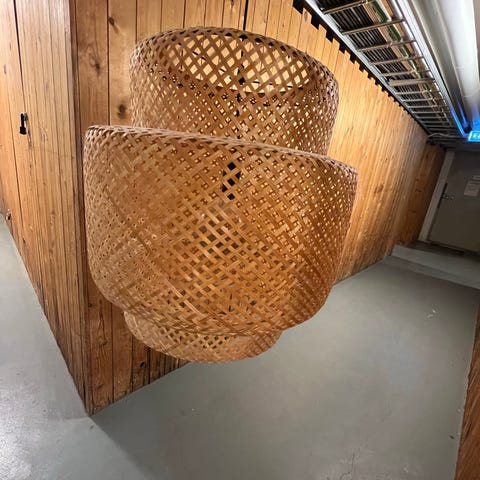 Taklampa i bambu (tror jag), i fint skick. Med en diameter på 50cm och en höjd på ca 40cm. Finns ej nån sladd. Finns på väster i Örebro.