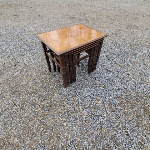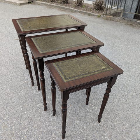 Tillverkat i mahogny med varm, djup ton och vacker lyster. De tre borden skjuts smidigt in i varandra och är både praktiska och dekorativa – perfekta som sidobord, lampbord eller för servering.